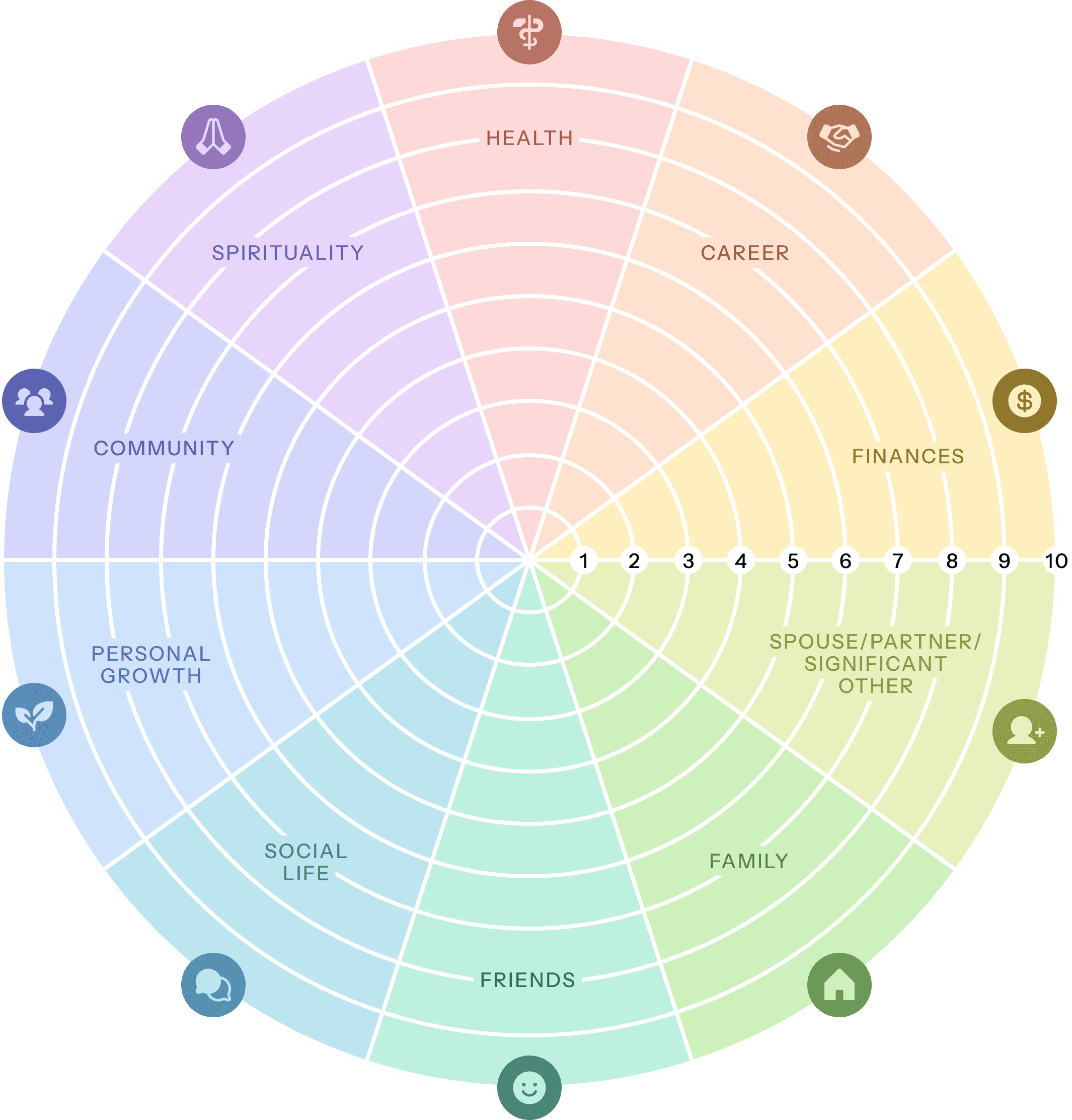 Dimensions or domains of life are listed on the outside of the wheel – Family, Social, Community, Profession, Personal, Recreation, Spiritual and Financial. Everyone’s life is different and so it okay to add a domain or remove on from those listed.